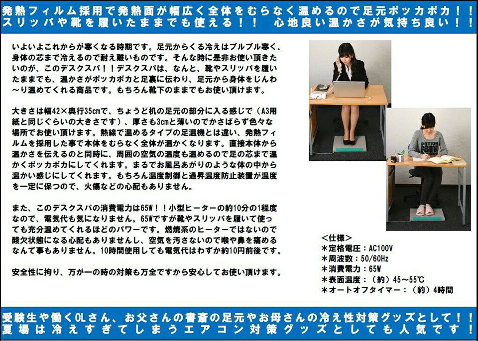 発熱フィルム採用で発熱面が幅広く全体をむらなく温めるので足元ポッカポカ! デスクスパは、なんと、靴やスリッパを履いたままでも、温かさがポッカポカと足裏に伝わり、足元から身体をじんわり温めてくれる商品です。